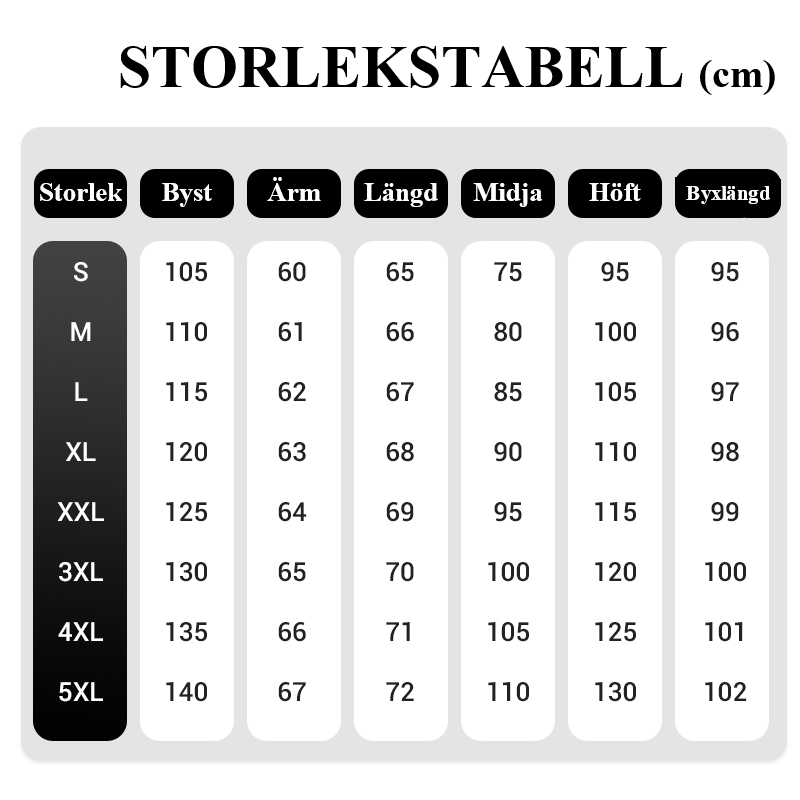 Om din överdel och byxor inte har samma storlek, välj den slutliga storleken utifrån storleken på din överdel!