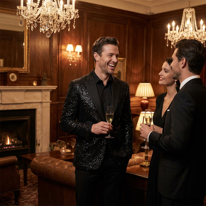 SPARKLING GALAXY FABRIC - Gör en oförglömlig ingång med ett unikt tyg som glittrar som en stjärnkväll. Denna iögonfallande design säkerställer att du är centrum för uppmärksamhet vid alla formella möten eller firanden.